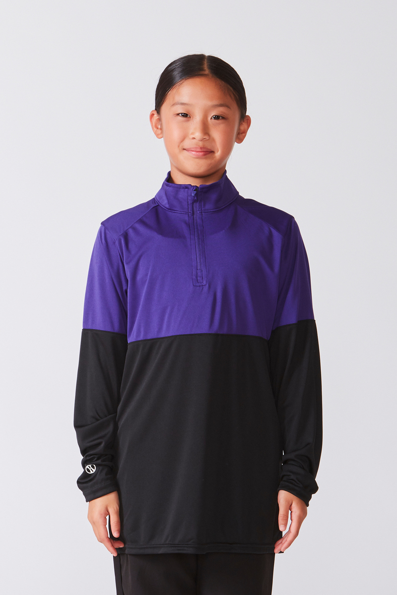 Power through warm‑ups in the Youth Momentum ¼ Zip Pullover — lightweight stretch knit with a stand collar and thumbholes. Perfect for competition days, outdoor practice, and bold sleeve logos.