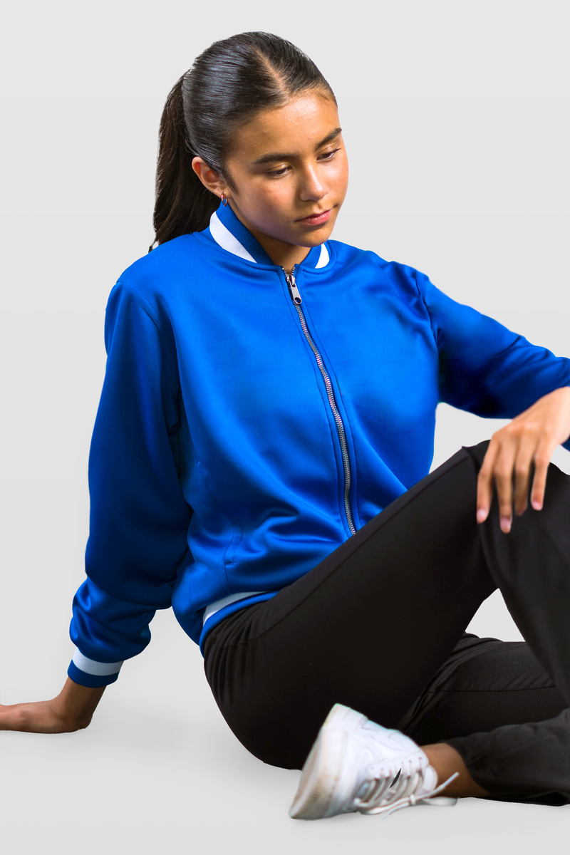 Own the throwback in the Ladies Vintage Full Zip Jacket — slim track silhouette with contrast sleeve stripes and stand collar. Perfect for faculty wear, jazz pieces, and embroidered chest crests.