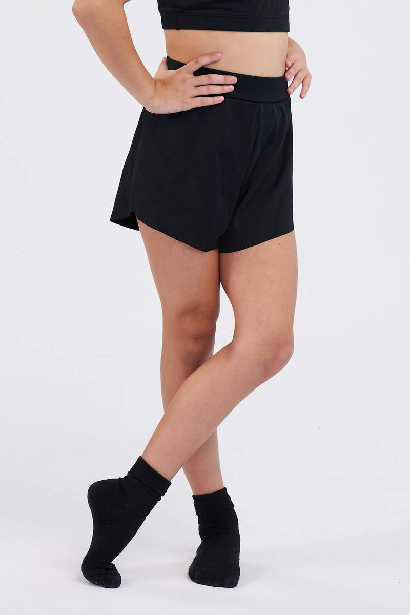 Float through combos in Girls Flowy Overlay Shorts — high‑waist briefs covered by airy chiffon that twirls on cue. Perfect for lyrical class, summer intensives, and rhinestone hip crests.