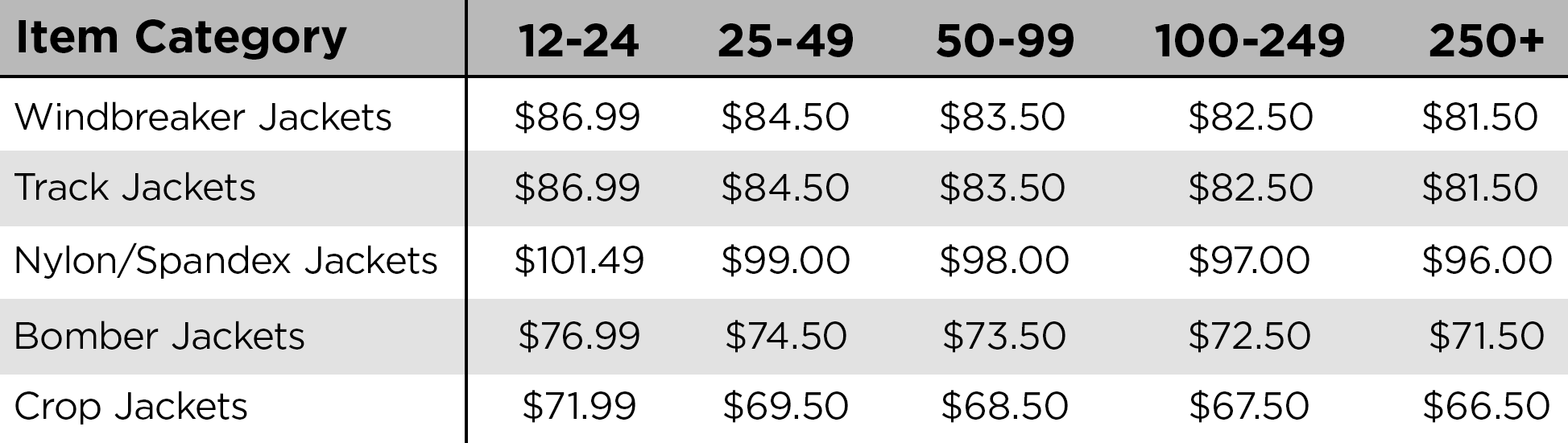 Want to stock up on your gear for less? Order more with us and you can save BIG. We offer discounts at 25, 50, 100, 250, and 500+ piece orders.